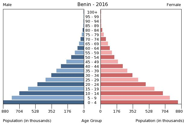 Benin has a youthful age structure – almost 65% of the population is under the age of 25 – which is bolstered by high fertility and population growth rates. Benin’s total fertility has been falling over time but remains high, declining from almost 7 children per women in 1990 to 4.8 in 2016. Benin’s low contraceptive use and high unmet need for contraception contribute to the sustained high fertility rate. Although the majority of Beninese women use skilled health care personnel for antenatal care and delivery, the high rate of maternal mortality indicates the need for more access to high quality obstetric care.