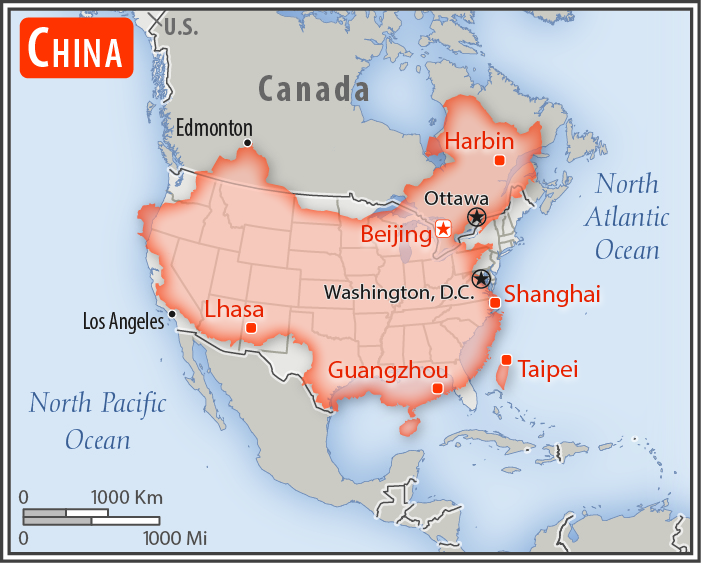 world's fourth largest country (after Russia, Canada, and US) and largest country situated entirely in Asia; Mount Everest on the border with Nepal is the world's tallest peak above sea level