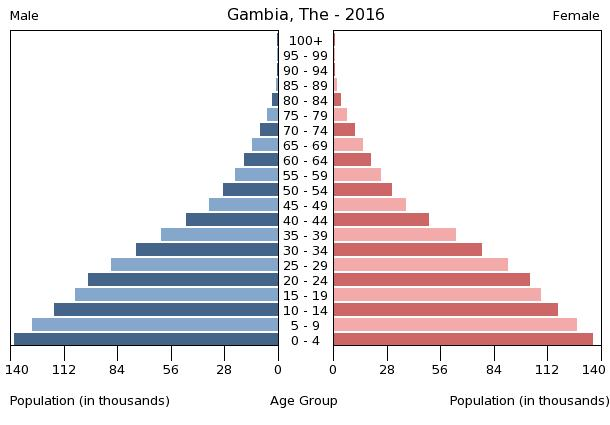 The Gambia’s youthful age structure – almost 60% of the population is under the age of 25 – is likely to persist because the country’s total fertility rate remains strong at nearly 4 children per woman. The overall literacy rate is around 55%, and is significantly lower for women than for men. At least 70% of the populace are farmers who are reliant on rain-fed agriculture and cannot afford improved seeds and fertilizers. Crop failures caused by droughts between 2011 and 2013 have increased poverty, food shortages, and malnutrition.