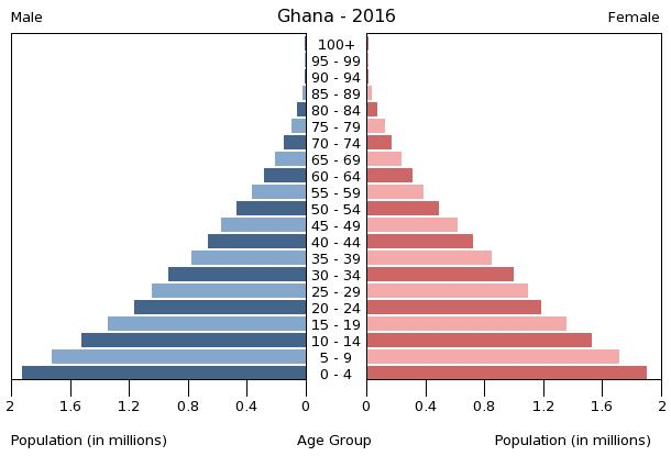 Ghana has a young age structure, with approximately 57% of the population under the age of 25. Its total fertility rate fell significantly during the 1980s and 1990s but has stalled at around four children per woman for the last few years. Fertility remains higher in the northern region than the Greater Accra region. On average, desired fertility has remained stable for several years; urban dwellers want fewer children than rural residents. Increased life expectancy, due to better health care, nutrition, and hygiene, and reduced fertility have increased Ghana’s share of elderly persons; Ghana’s proportion of persons aged 60+ is among the highest in sub-Saharan Africa. Poverty has declined in Ghana, but it remains pervasive in the northern region, which is susceptible to droughts and floods and has less access to transportation infrastructure, markets, fertile farming land, and industrial centers. The northern region also has lower school enrollment, higher illiteracy, and fewer opportunities for women.