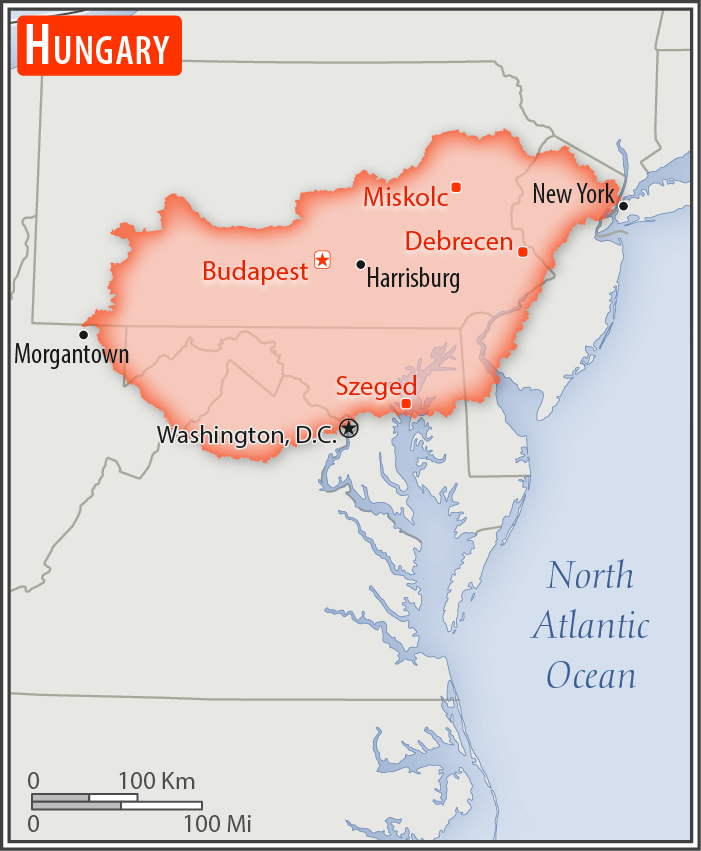 landlocked; strategic location astride main land routes between Western Europe and Balkan Peninsula as well as between Ukraine and Mediterranean basin; the north-south flowing Duna (Danube) and Tisza Rivers divide the country into three large regions