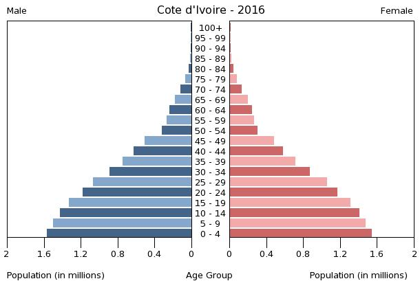 Cote d’Ivoire’s population is likely to continue growing for the foreseeable future because almost 60% of the populace is younger than 25, the total fertility rate is holding steady at about 3.5 children per woman, and contraceptive use is under 20%. The country will need to improve education, health care, and gender equality in order to turn its large and growing youth cohort into human capital. Even prior to 2010 unrest that shuttered schools for months, access to education was poor, especially for women. As of 2015, only 53% of men and 33% of women were literate. The lack of educational attainment contributes to Cote d’Ivoire’s high rates of unskilled labor, adolescent pregnancy, and HIV/AIDS prevalence.