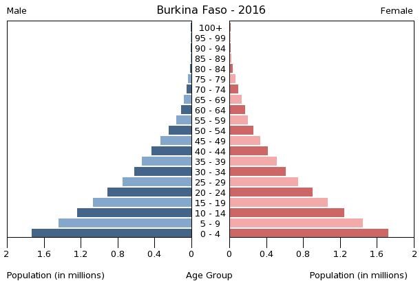 Burkina Faso has a young age structure – the result of declining mortality combined with steady high fertility – and continues to experience rapid population growth, which is putting increasing pressure on the country’s limited arable land. More than 65% of the population is under the age of 25, and the population is growing at 3% annually. Mortality rates, especially those of infants and children, have decreased because of improved health care, hygiene, and sanitation, but women continue to have an average of almost 6 children. Even if fertility were substantially reduced, today’s large cohort entering their reproductive years would sustain high population growth for the foreseeable future. Only about a third of the population is literate and unemployment is widespread, dampening the economic prospects of Burkina Faso’s large working-age population.